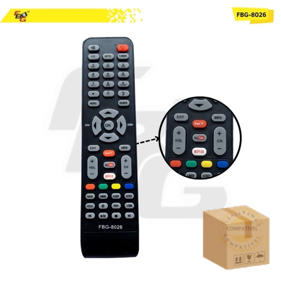 O Controle Remoto da FBG foi projetado para oferecer praticidade, qualidade e durabilidade. Fabricado com materiais de alta qualidade, ele possui teclas macias, plástico resistente e um LED transmissor com excelente tempo de resposta, garantindo uma experiência de uso rápida e eficiente.