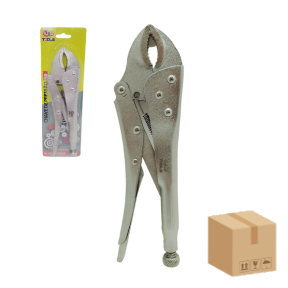 Descrição: Chave de pressão feita com aço carbono de alta qualidade, forte e durável. Mandibulas curvas com 4 pontos sobre porcas e parafusos de contato para maior pressão. Alavanca de rápida liberação. Indicada para prender, segurar ou puxar objetos com mais firmeza.